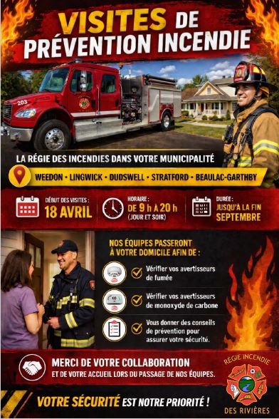 La Régie incendie des rivières débutera ses visites résidentielles dans les municipalités de son territoire. Les visites débuteront à compter du samedi 18 avril 2026 jusqu'au 30 septembre 2026 sur les heures de 9 h à 20 h.